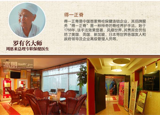 “得一正脊”养生馆的独到手法在“罗氏正骨”的基础上,集众家之长,独创了集治疗、康复、保健为一体的正脊按摩术。其功效为:纠脊椎之偏差,疏全身之经络,调人体之阴阳,护脊柱之健康,养一身之正气,增强体质,预防疾病,消除亚健康!以尽天年。