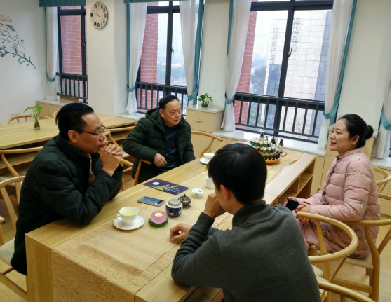 党支部书记薛建泰与重庆时代职业培训学校校长韦训前及余教授交流“小儿推拿专业委员会”的筹备进展相关事项。