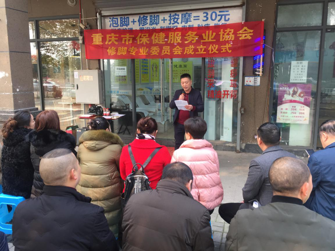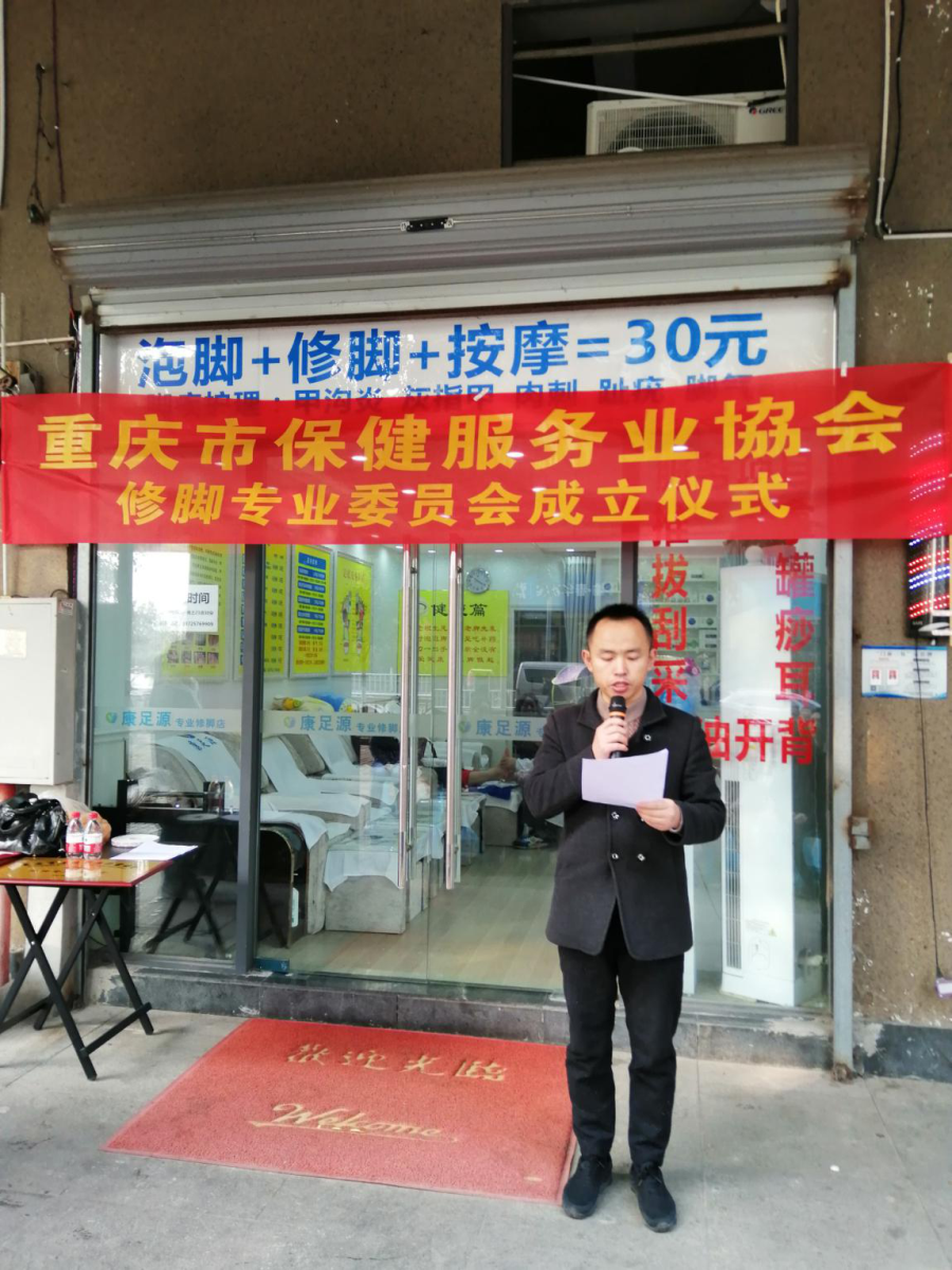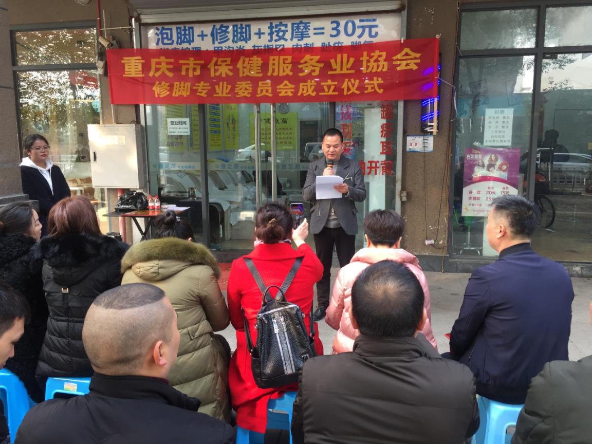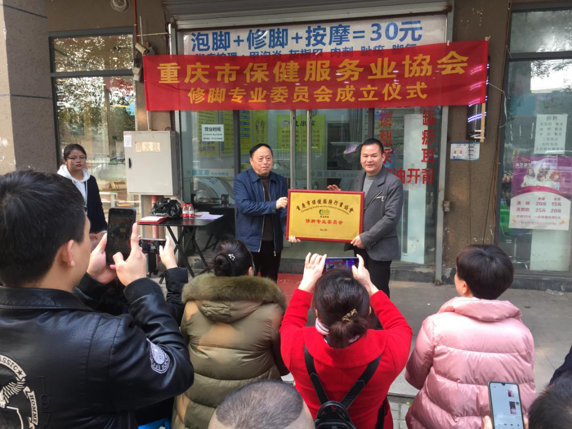 12月10日上午10点,重庆市保健服务行业协会在重庆沙坪坝大学城足康修脚房举行“修脚专业委员会”成立及授牌仪式,仪式由协会秘书李清主持。