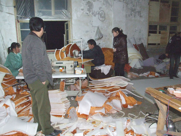 永升沙发生产车间的工人正在进行产品的组装流程