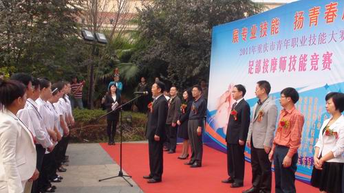 上午9:30举行了“展专业技能 扬青春风采” 2011年重庆市青年职业技能大赛·足部按摩师技能决赛启动仪式。重庆市商业委员会、共青团重庆市委、重庆市人力资源和社会保障局、重庆市职业技能鉴定(指导)中心等部门的负责人和承办此次活动的重庆市保健按摩行业协会及各参赛单位和参赛选手共同参加了启动仪式。