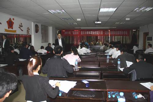 下午14;00进行了理论培训,唐成林教授在理论培训中解答了参赛选手们提出的疑问,下午16:30—18:00,在重庆市职业技能鉴定中心技能竞赛科石珊等人的监督和巡视中进行了理论考核决赛。