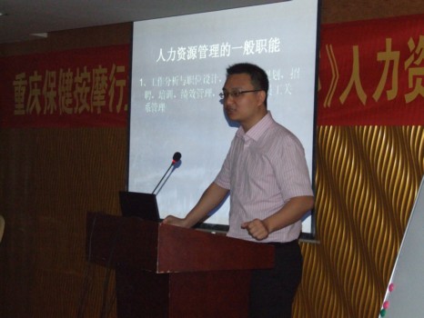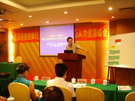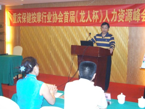 邀请重庆市劳动技能鉴定所领导参加、重庆工学院人力资源管理系专家参加、重庆市各大保健城、浴足城老板参加。会议内容:本次会议主要为专家谈人力资源的招、培、管,及大家谈人力资源的对行业的制约因素及解决方案。共同探讨重庆保健按摩行业在发展中遇到的瓶颈问题,并就人力资源的开发、引进、选拨、培训、流动、置换等问题开展专题讨论。