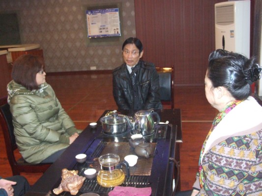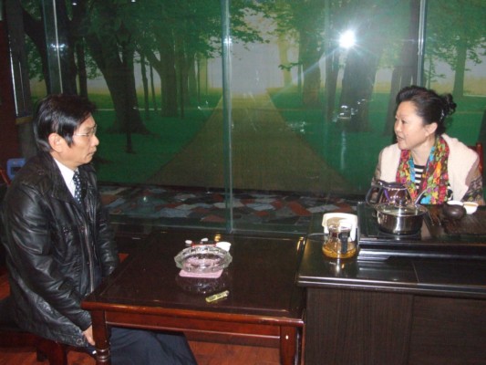 会长郭家荣(左)听取红宝石与北芝堂会员单位负责人对项目的介绍
