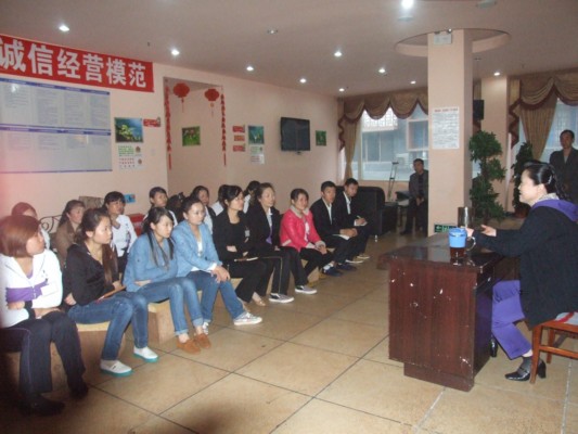 景屏女士在考察合川区南海足道时向员工讲话