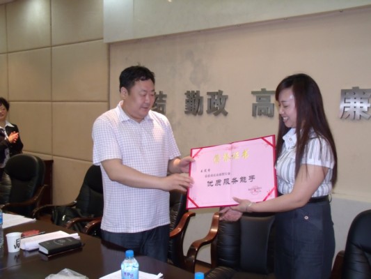 梁平县商务局周书记为获得行业“服务能手”的员工颁发荣誉证书