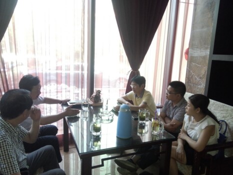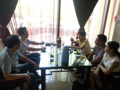 秀山县工商联的成员与市保健按摩行业协会的郭家荣会长(右三)交谈