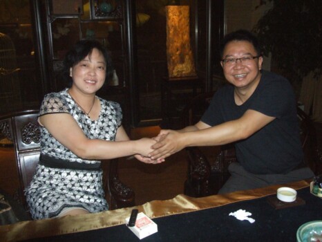 丽草源--品牌按摩精油的创始人向总(右)与扬桥文化的朱总(女)握手