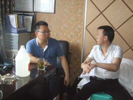 丽草源--品牌按摩精油的创始人向总(左)与重庆宝岛皇宫的胡总交流