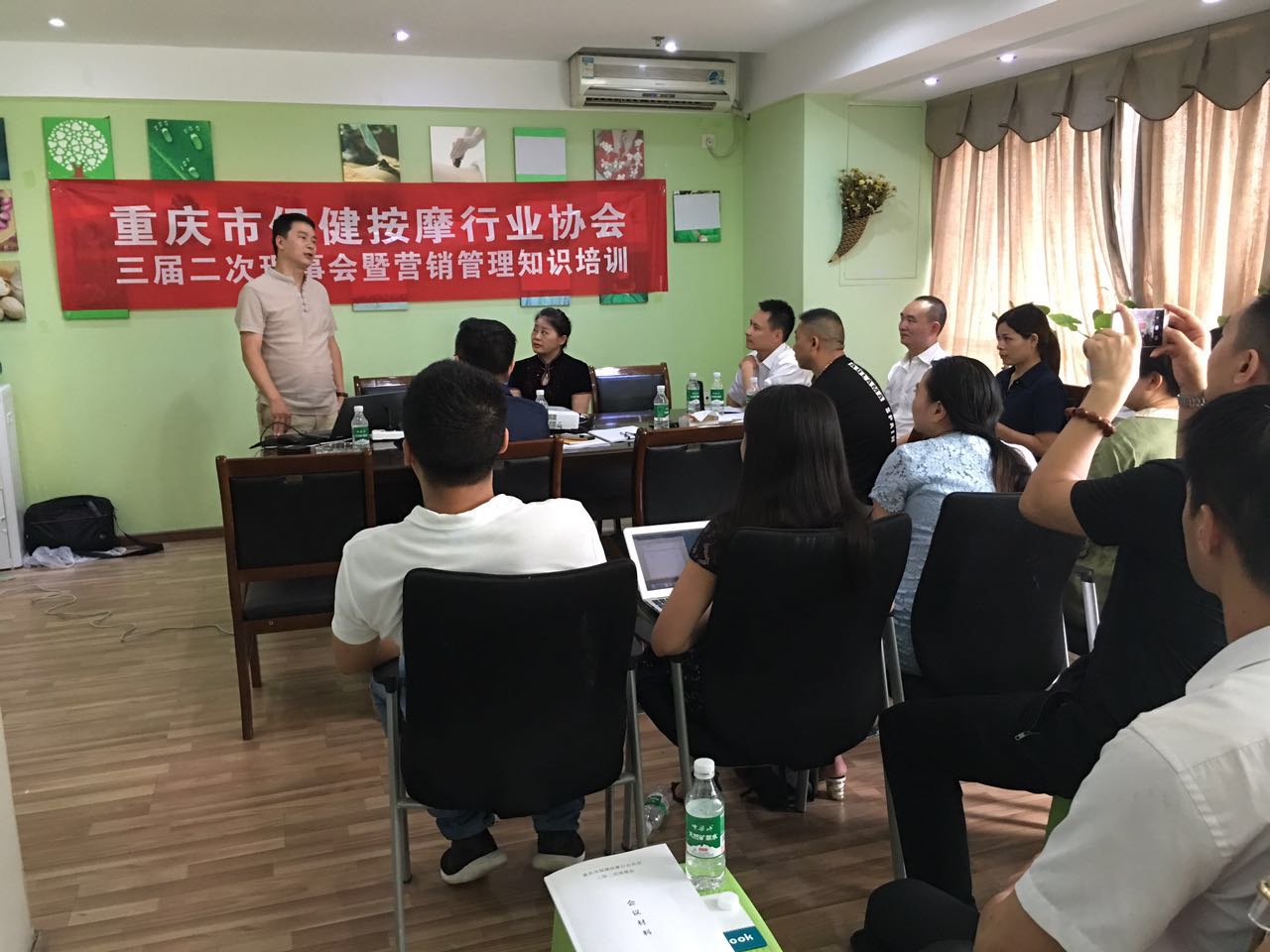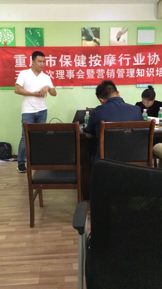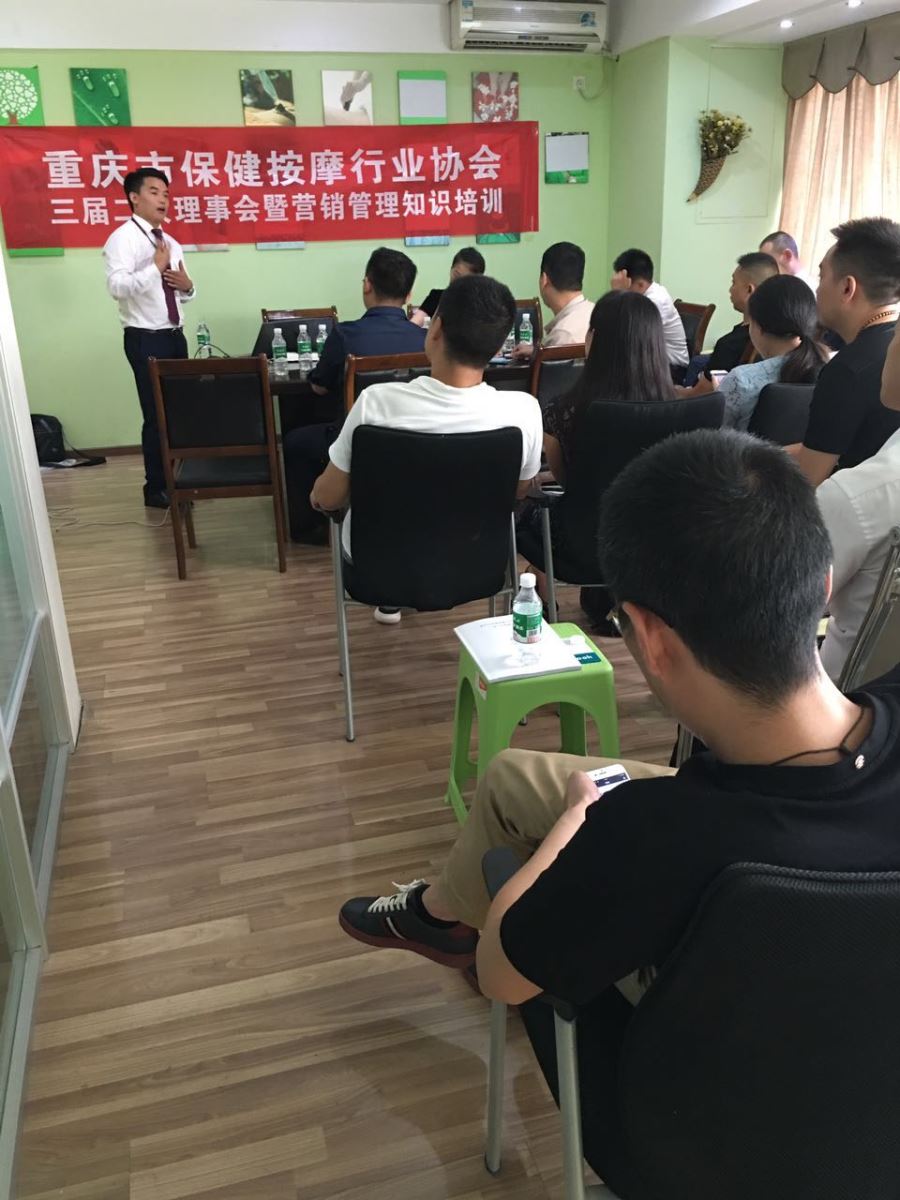 下午一点半协会举办了提升会员单位整体素质的培训活动。重庆劲道足浴有限公司董事长牟伟与大家分享自身成长的心路里程以及市场营销的知识,他的授课引起了大家的共鸣。