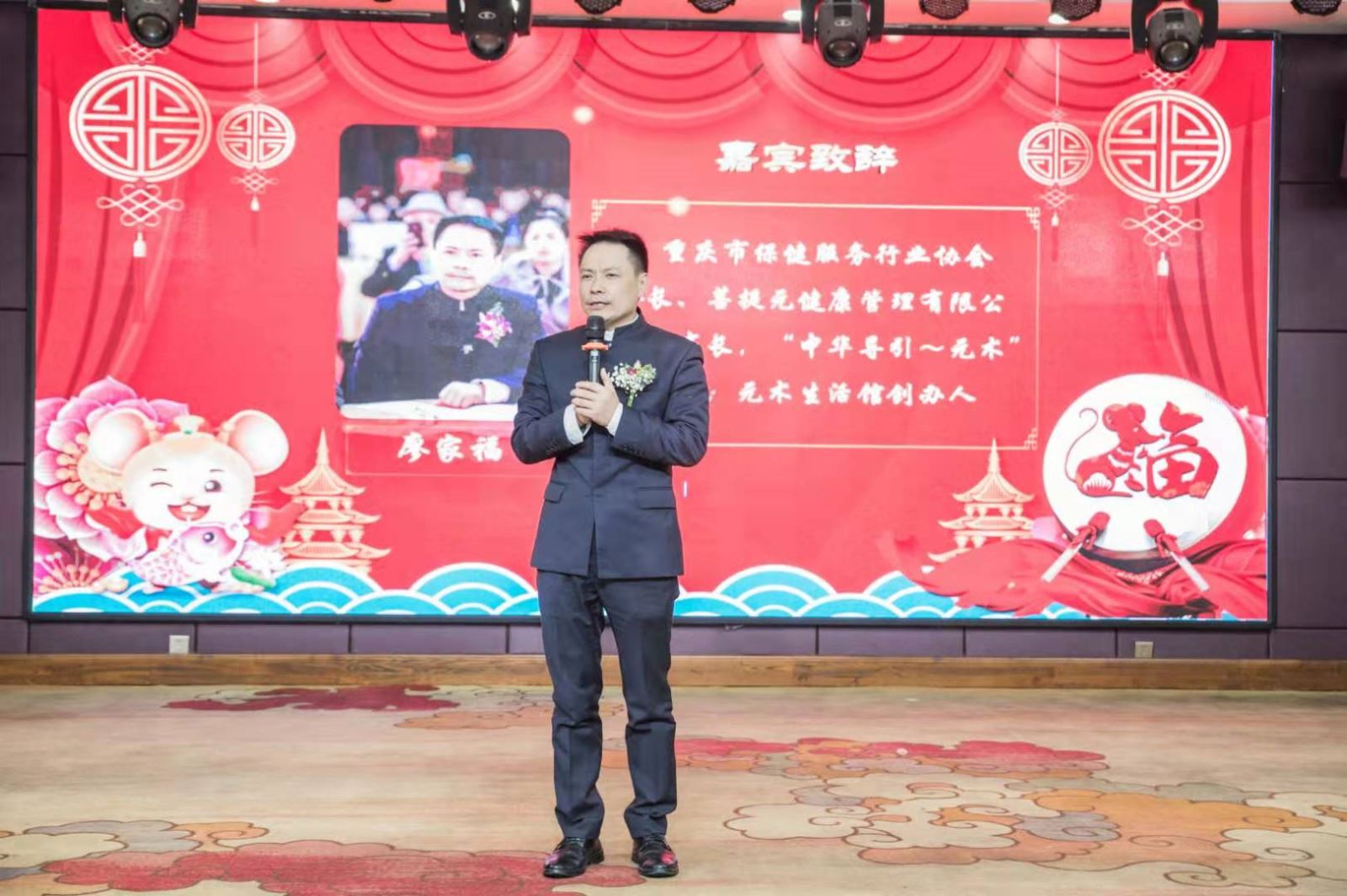 协会会长廖家福和党支部书记参加了渝润雨健康管理有限公司举办年会活动,廖家福会长到会致致词,带去了协会组织对企业和从业人员的现场问候,薛建泰书记向公司颁发了行业十佳保健服务品牌和协会巴南办事处匾牌,并与全体员工合影留念。