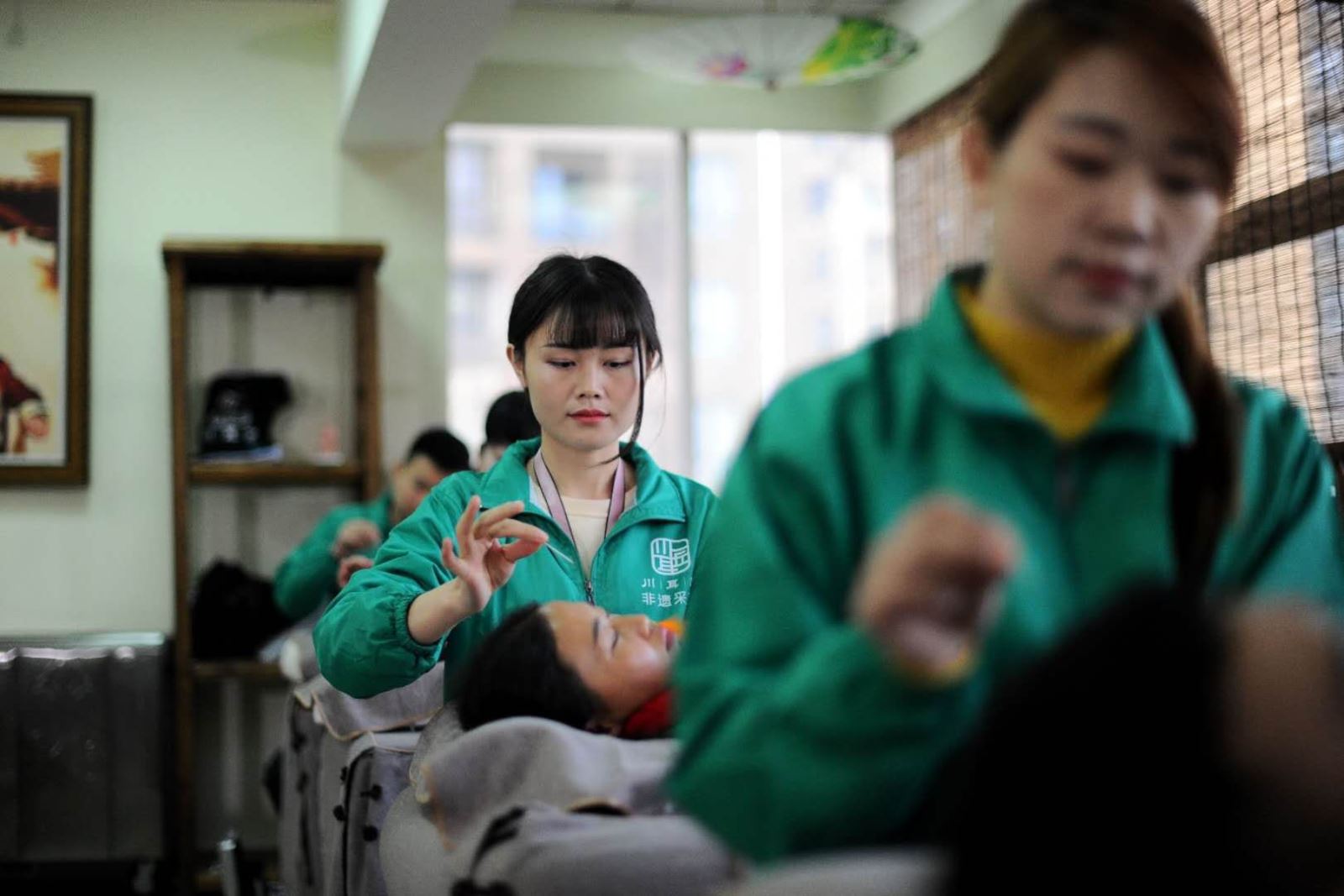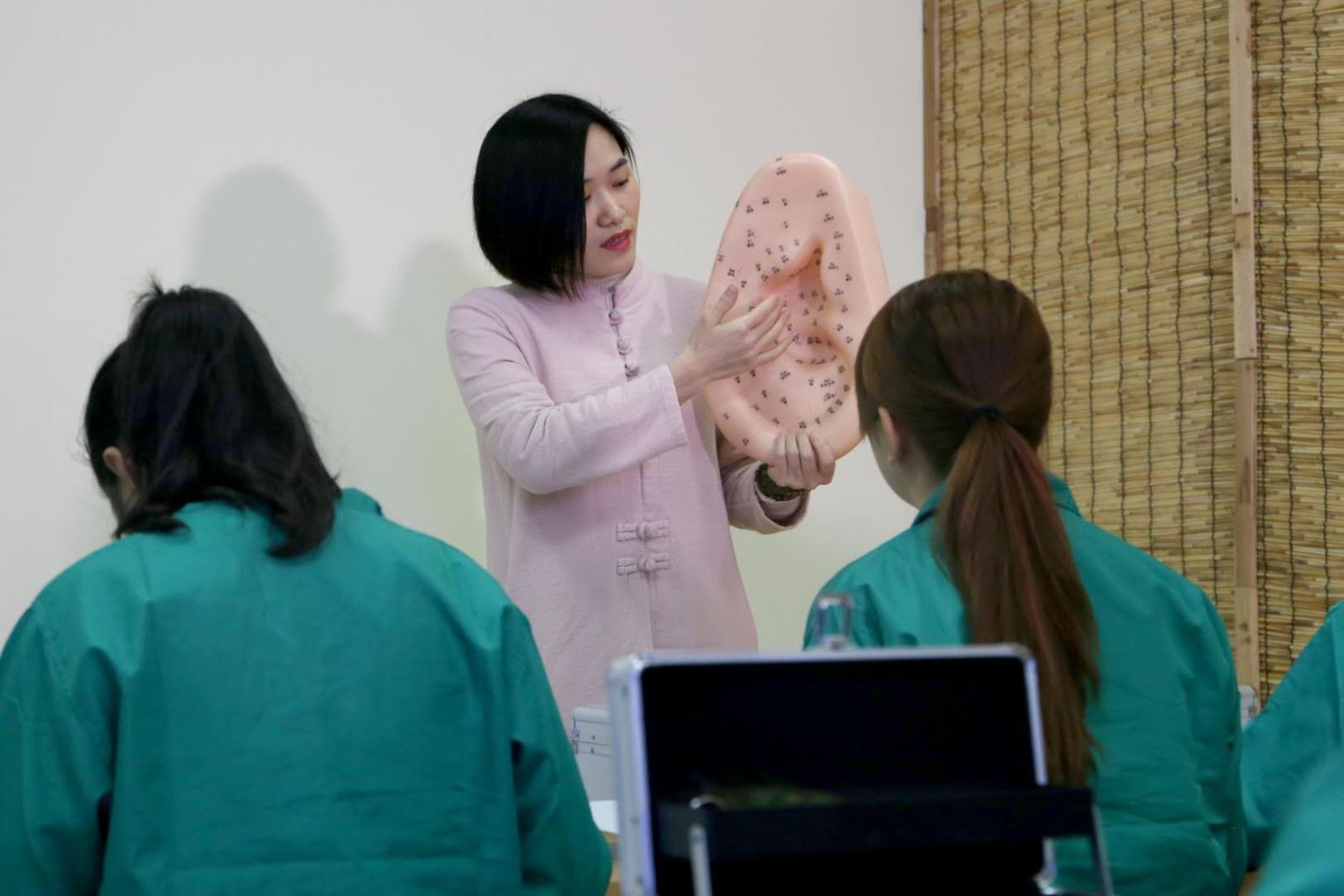 培训基地的墙上写着“一双手养活一家人,一颗心感恩全社会,用传统技艺做好健康养生事业。”激励学员认真学习技术,提升技能,正在进行采耳技能培训现场,老师讲的认真,教的得法,学员学的努力,做的仔细,培训课堂有条不紊的进行。