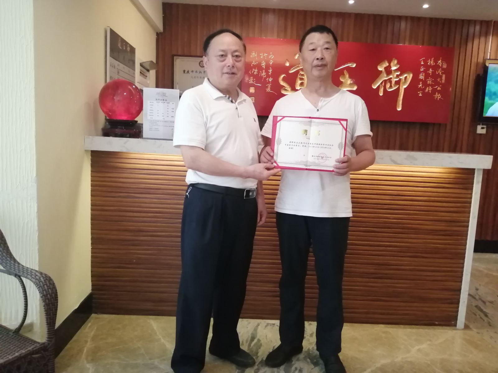 又讯:6月5日下午,党支部书记薛建泰在参加完川渝文旅康养项目合作启动会后,专程到位于重庆宝利高尔夫俱乐部,非物质文化文化九禽形意推拿功法式传承人王正国的御王道会所,看望他,并代表协会为他颁发专家委聘书,王正国非常愉快地接受聘任和聘书,书记薛建泰与他进行了亲切的交谈。