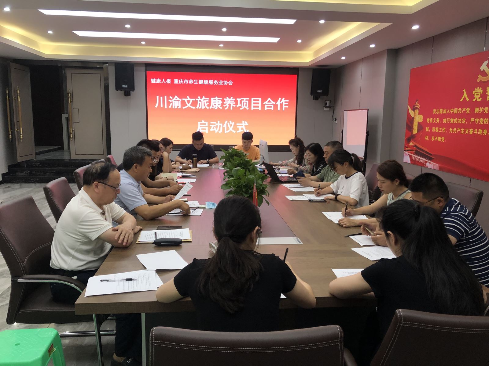 6月5日上午,川渝文旅康养项目合作启动会在重庆市养生健康服务业协会会议室举行。重庆《健康人报》介绍重庆的合作规划,四川旅游景区公司和宝山旅游景区代表介绍四川合作项目。协会会长廖家福、党支部书记薛建泰、重庆创意产业协会会长吴扬文、重庆养生健康服务业协会执行会长邱继烈、重庆都市传媒集团负责人、重庆康养协会会长黄蔷和相关企业参加启动会。