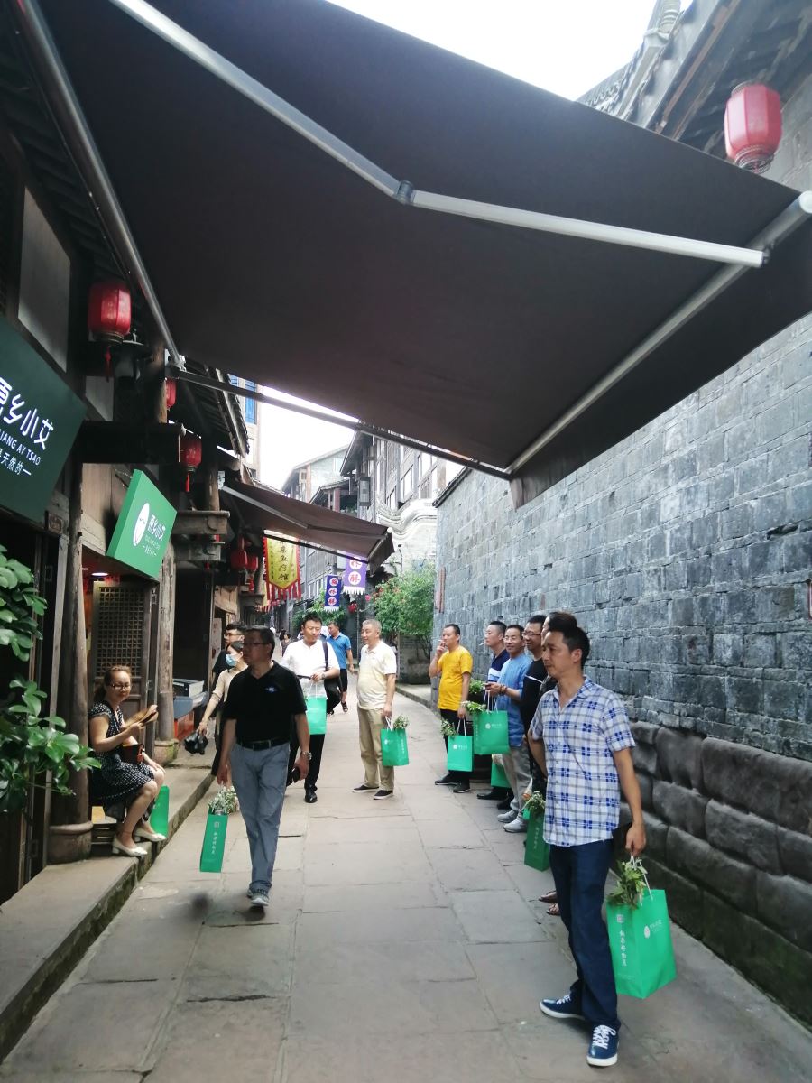 种植基地活动结束后,陈平董事长还带领大家参观了设在安居古镇原乡小艾销售窗口和古镇风貌。