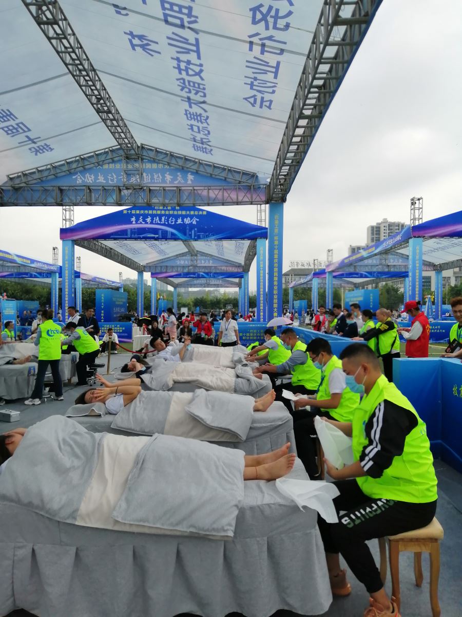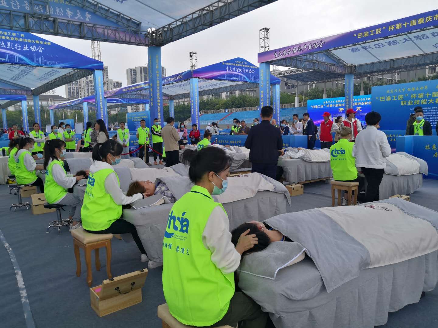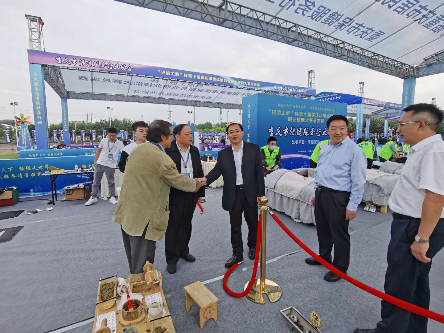 重庆市保健服务行业协会经由层层选拔,依据初赛成绩共推选出40名选手参与2020年保健服务项目总决赛。比赛间隙,市商务委总经济师李巡府、市商务委生活服务业发展处处长何军、市人社局职业技能发展处处长兰云鹏、市人社局职业技能鉴定中心主任蹇小林、市总工会、市妇联市共青团相关领导以及重庆商务职业学院党委书记谭勇及院长冉光学等来我会比赛现场巡查并指导工作,我会党支部书记薛建泰为其介绍了本次的参赛项目的比赛内容以及重庆真艾农业有限公司的产品原乡小艾、艾灸专业委员会的艾灸灸具体验、小爱科技的鞋垫制作。