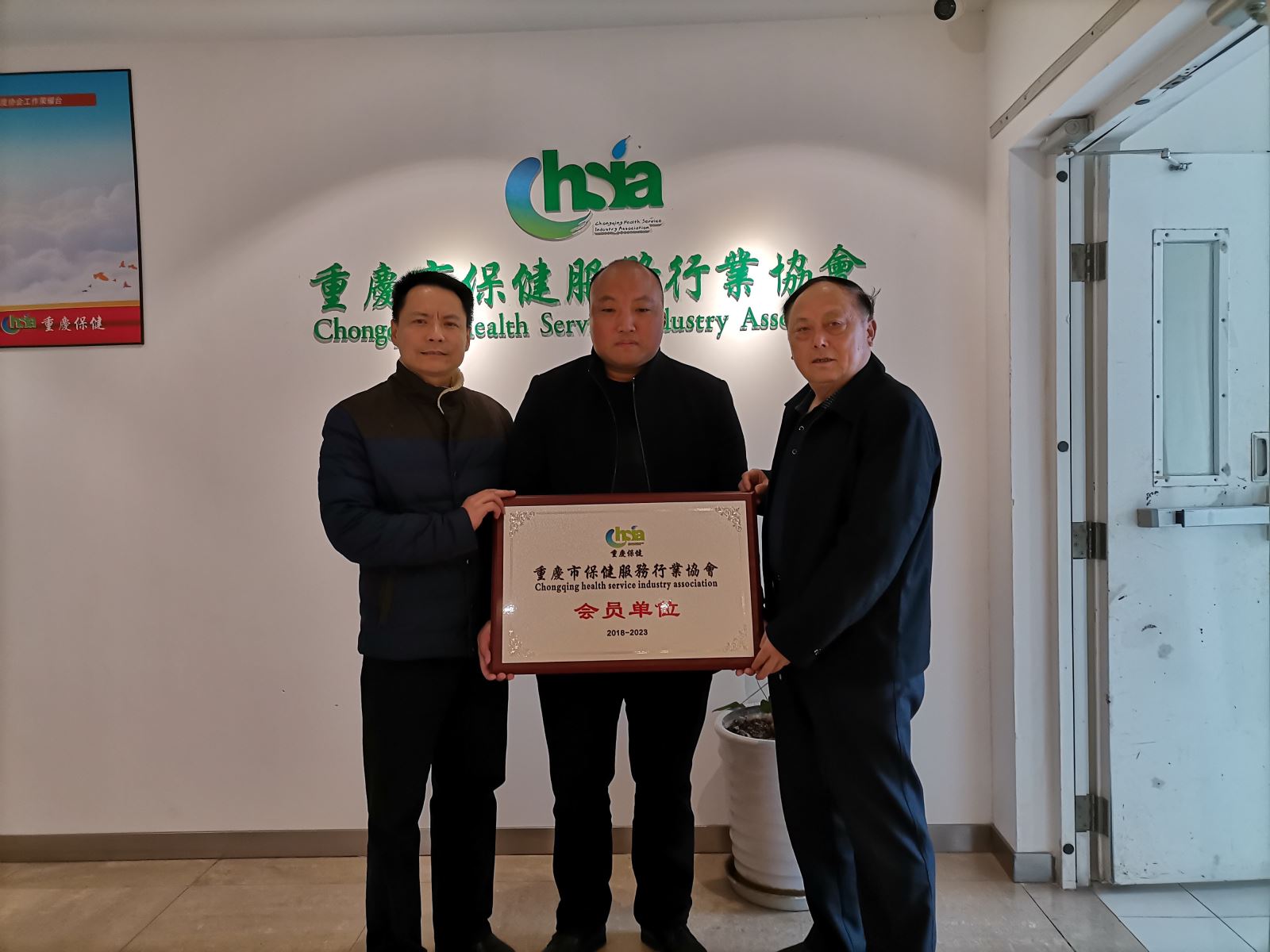 又讯:重庆剑涛科技有限公司是春节前完成办理了加入协会的程序的会员单位,2月23日,总经理程一剑到访协会秘书处,秘书处全体人员和他互致节日问候,会长廖家福、党支部书记薛建泰共同为其颁发了重庆市保健服务行业协会会员单位牌匾。