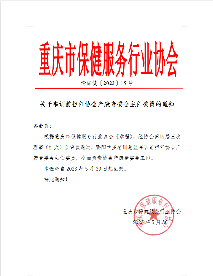 根据重庆市保健服务行业协会《章程》,经协会第四届三次理事(扩大)会审议通过,骄阳兰多培训总监韦训前担任协会产康专委会主任委员,全面负责协会产康专委会工作。