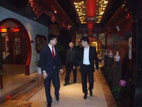 座谈会前的上午十点左右,市公安局场管支队负责人(右一)到富侨文化宫店考察