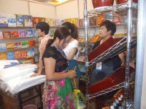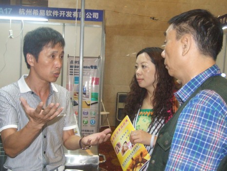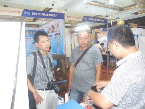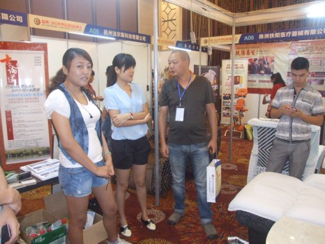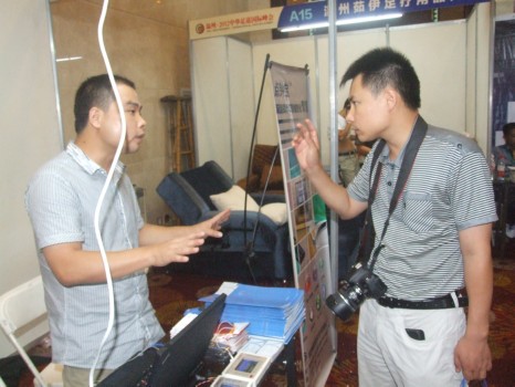 国家高级足部按摩师郑清伟(右一)与配套展商交流