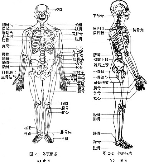 1.躯干部的体表标志 胸骨:胸骨柄、胸骨体、剑突。肋骨:第二到第十二肋骨、第一到第十肋软骨。椎骨:颈椎、胸椎、腰椎、骶骨、尾骨。