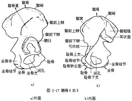 ①髂骨 位于髋骨上外。骨的上部宽而扁薄,叫髂骨翼。翼上缘变厚,叫髂嵴。髂嵴前方突起部叫髂前上棘,下方突起部叫髂前下棘。髂骨内面的凹陷叫髂窝,髂窝后部的两个粗糙面分别称耳状面和髂粗隆。髂骨内面稍显弯曲的部分叫弓状线(如图2—17)。