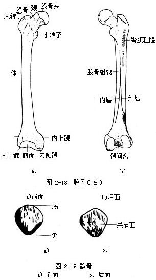 ①股骨 是人体骨胳中最大的长骨。分为上下端和中间的骨体(如图2—18)。上端似球形叫股骨头,头下方较细的部分叫股骨颈。骨体上方较大隆起叫大转子,在大转子后下方的小突起叫小转子。股骨后面在骨的长轴上有一条股骨粗线。股骨下端膨大,其后面的两个隆起,分别叫内、外侧髁。髁间的凹陷叫髁间窝。两髁上各有一隆起,分别叫内、外上髁。