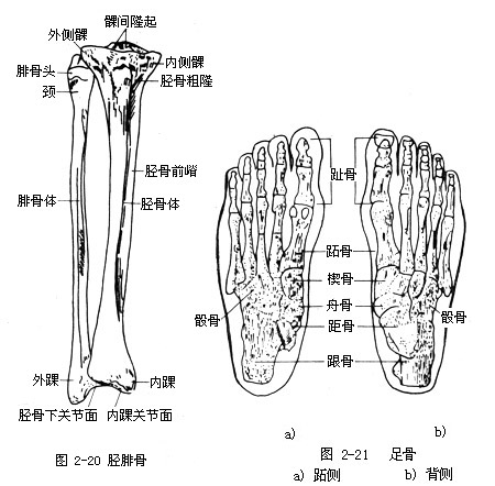 ④腓骨 位于胫骨的外侧。上端膨大叫腓骨头。下端较长,超过胫骨部分叫外踝(如图2—20)。