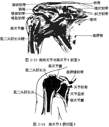 2.肩关节 肩关节由肩胛骨的关节盂和肱骨头构成。肩关节囊附着在关节盂缘和肱骨解剖颈上,’极为松弛,可使两关节面分离达2.5厘米。关节囊上有喙肱韧带,.前有盂肱韧带加强。整个肩关节的上前方有喙突,正上方有肩峰和喙肩韧带保护(如图2—23,图2—24)。