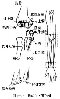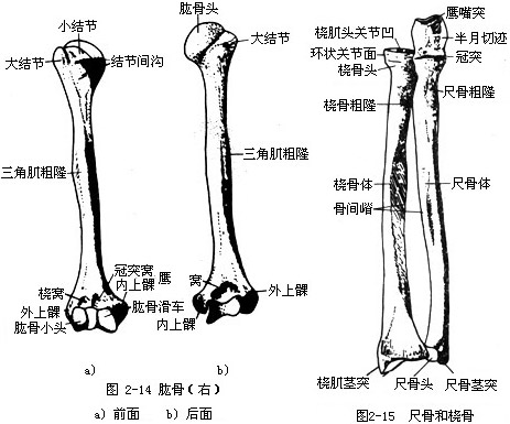 ①肱骨 是典型的长骨。肱骨上端的膨大叫肱骨头。肱骨头前方粗糙的突起叫小结节;外方的突起叫大结节。肱骨体外侧粗糙的隆起叫三角肌粗隆。肱骨远端后面的窝叫鹰嘴窝;前面内侧窝叫冠突窝,外侧的窝叫桡窝。冠突窝下方的突起叫肱骨滑车,桡窝下方圆形的突起叫肱骨小头,两者均有关节面。在肱骨远侧端的内侧的突起叫内上髁;外侧的突起叫外上髁(如图2—14)。