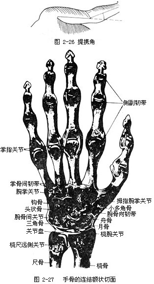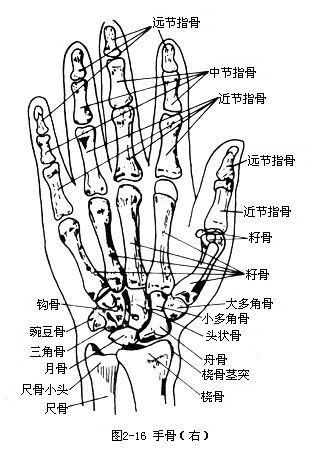 ④手骨 手骨由8块腕骨、5块掌骨、14块指骨组成(如图2—16)。