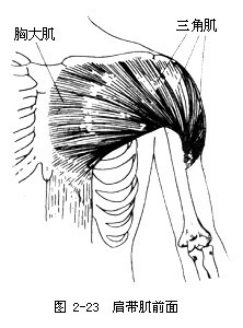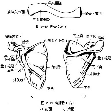 ②肩胛骨 肩胛骨前面凹陷,叫肩胛下窝,后面隆起,叫肩胛冈,并分成冈上窝与冈下窝。肩胛冈外端的增高与膨大部分叫肩峰,锁骨与其相连。外侧角有一浅凹叫关节孟,与肱骨头构成关节。关节盂的内侧上有一指状突起叫喙突(如图2—13)。