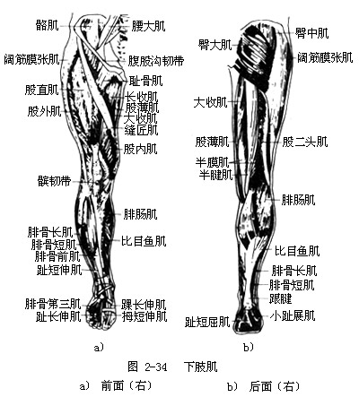 14.使小腿伸的肌群——股四头肌位于大腿的前表面,多起于髂前上棘,股骨嵴外唇内唇及体部。止于胫骨粗隆。使大腿屈,小腿伸(如图2—36)。