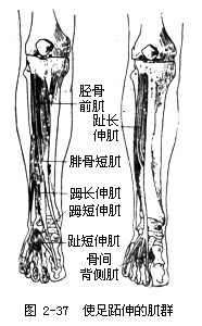 16.使足跖伸的肌群——胫骨前肌、趾长伸肌、坶长伸肌等多起自胫骨的上部及外侧面。功能是使足伸(如图2—37)。