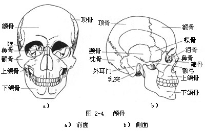 1.颅骨 由23块骨组成。颅骨以眶上缘至外耳门下缘的连线为界,分成上下两部分,上部为脑颅,下部为面颅(如图2—4)。