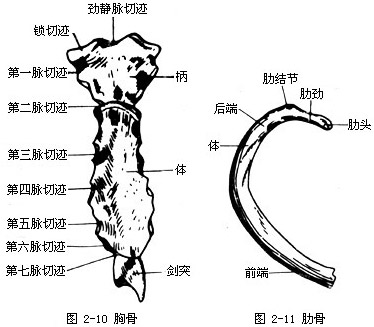 (3)肋骨 共有12对。肋分前后端和体三部分。后端包括肋头、肋颈和肋结节等。肋的前端借助软骨和胸骨相连,后端与相应的胸椎构成关节(如图2—11)。