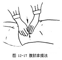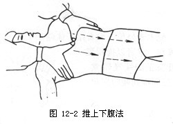 2.手法操作术者以两手拇指掌侧,对置脐下阴交穴,余指分置腹部西侧,自上向下逐步推动,经过石门、关元、中枢到曲骨穴止,反复操作数次(如图12-2)。