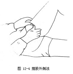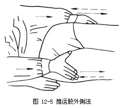 2.操作 术者以双手掌根部着力于两股外侧,上下反复推运,推而前行,运而拉回,持续推运数次(如12-5)。