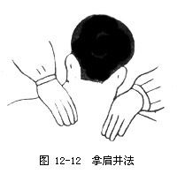 2.操作 术者以两手四指置肩后,拇指掌侧分别置于两侧肩井穴处,着力向上提拿数次(如图12—12)。