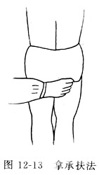 2.操作 术者以一手拇指置于承扶穴,余指置股外侧,拿定肌肉后,向上提拿。反复操作数次(如图12—13)。