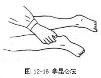 再以拇指食指相对置于跟腱两侧之内,外昆仑穴处,拿提数次(如图12—16)。