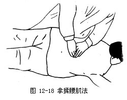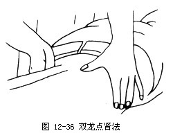 2.操作 术者两拇指伸直以指端置于两侧肾俞穴,余指扶定体两侧。两拇指同时着力对点,以连续点按三次为宜(如图12—36)。