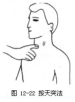 (2)术者再以食指顶端置天突穴处,向外下方点按3~5分钟(如图12—22)。