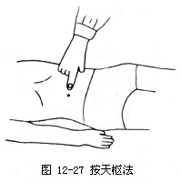 2.操作术者以一手拇指、食脂指腹,分置两侧天枢穴,着力长按1~2分钟(如图12—27)。