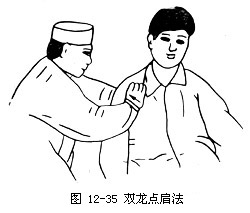 2.操作 术者两手拇指伸直,微屈四指,用拇指端置于肩前窝的抬肩穴,肩后窝的孺俞穴,同时着力j相对点按(如图12—35)。