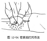 2.操作 术者以单手或双手三指(或五指)端在股外侧,以风市穴为中心进行快速凑合。一松一紧,一张一合,一起一落地反复啄拿数遍。后以手指并拢,伸直,拍打密拿过的风市穴上、下,反复操作数遍(如图12—54)。