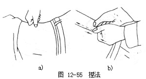 2.操作 术者的拇指与四指的指腹对合力交替、反复、持续、均匀地捏拿皮肉肌筋。使局部在指的不断对合转动下捏起,再以手的自然转动,使皮肉肌筋自指腹间滑脱出来,如此反复交替进行,循序移动(如图12—55)。