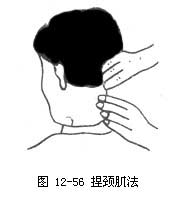 2)操作 术者两手并置于风池穴处,拇指在颈肌外侧,余指在颈肌内侧,将一倾:颈肌微向上拿起,自上向下捏拿到肩中俞反复数次,左右分别进行(如图12—56)。