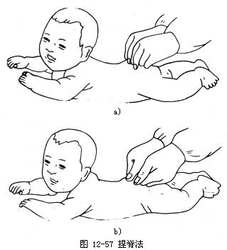 2)操作 术者两拇指桡侧面置尾骶部皮肤,食、中指前按与拇指相对用力捏起皮肤,随捏随提,双手分别捻动向前推移到大椎穴处,进行捏拿推捻提放按揉脊柱及两侧肌肤,连续操作5~6遍。另一种手法是拇指在前,食指屈曲在后进行上述捏拿推捻提放按揉等手法动作(如图12—57)。