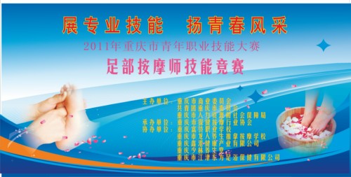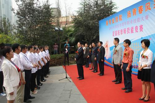 上午9:30举行了“展专业技能 扬青春风采” 2011年重庆市青年职业技能大赛·足部按摩师技能决赛启动仪式。重庆市商业委员会、共青团重庆市委、重庆市人力资源和社会保障局、重庆市职业技能鉴定(指导)中心等部门的负责人和承办此次活动的重庆市保健按摩行业协会及各参赛单位和参赛选手共同参加了启动仪式。